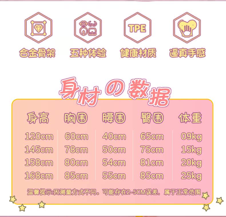 我们的娃娃全部都是硬骨骨架的娃娃,网络上面400元左右1米身高的实体娃娃,骨架都是软的,制作的材料都是回收的二手材料。娃娃是个人私密用品,用这种有毒材质的娃娃,您真的敢用吗?我们工厂生产的娃娃,使用的都是进口医用级别材料,都有安全质检报告的,可以放心安全使用,您可以向我们索取质检报告!