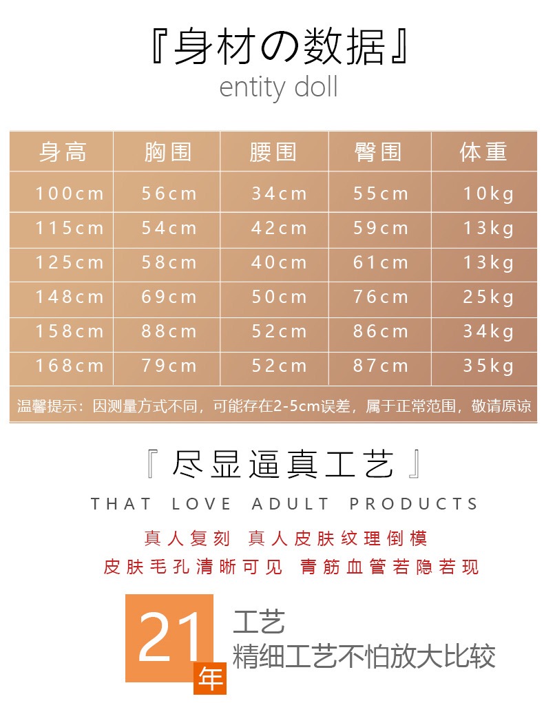 我们工厂成立于2013年,我们拥有10多年的实体娃娃生产经验,是行业当中的佼佼者,我们拥有21年经验的艺术雕刻大师,用独特的手工雕刻将实体娃娃的脸型精细运用到极致,让您看着就很有感觉,整个立体五官轮廓也是非常精致漂亮可爱,那种感觉叫做刚刚好,特别是穿好丝袜,穿上性感情趣衣服的时候,视觉上跟真人没什么区别,那前凸后翘的火辣身段,修长白晳的大美腿,完美白晳无暇的肌肤,清澈明亮的瞳孔,弯弯的柳叶眉,性感的双唇如玫瑰花瓣娇嫩欲滴,长长的睫毛微微地颤动着,身体的毛孔和血管青筋若隐若现,酥胸软似云,当您触摸她的时候,您会发现,她的手感其实比真人还要香!这不就是一个真人吗?
