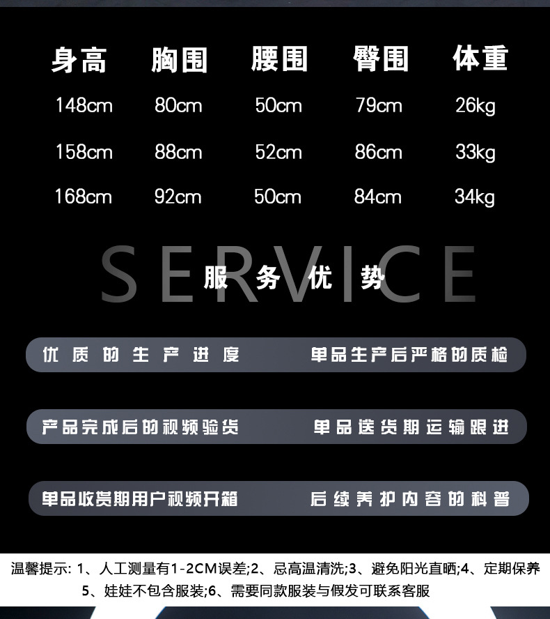 我们的娃娃全部都是全实体带骨架的实体娃娃,网络上面10元到400元的娃娃或者800元左右1.6米身高或者1.7米身高的娃娃,全部都是充气娃娃或者半充气娃娃。商家会拿一些假图片、假视频欺骗您说是实体娃娃!