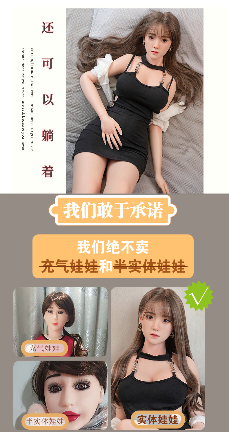 我们的娃娃全部都是全实体带骨架的实体娃娃,网络上面10元到400元的娃娃或者800元左右1.6米身高或者1.7米身高的娃娃,全部都是充气娃娃或者半充气娃娃。商家会拿一些假图片、假视频欺骗您说是实体娃娃!