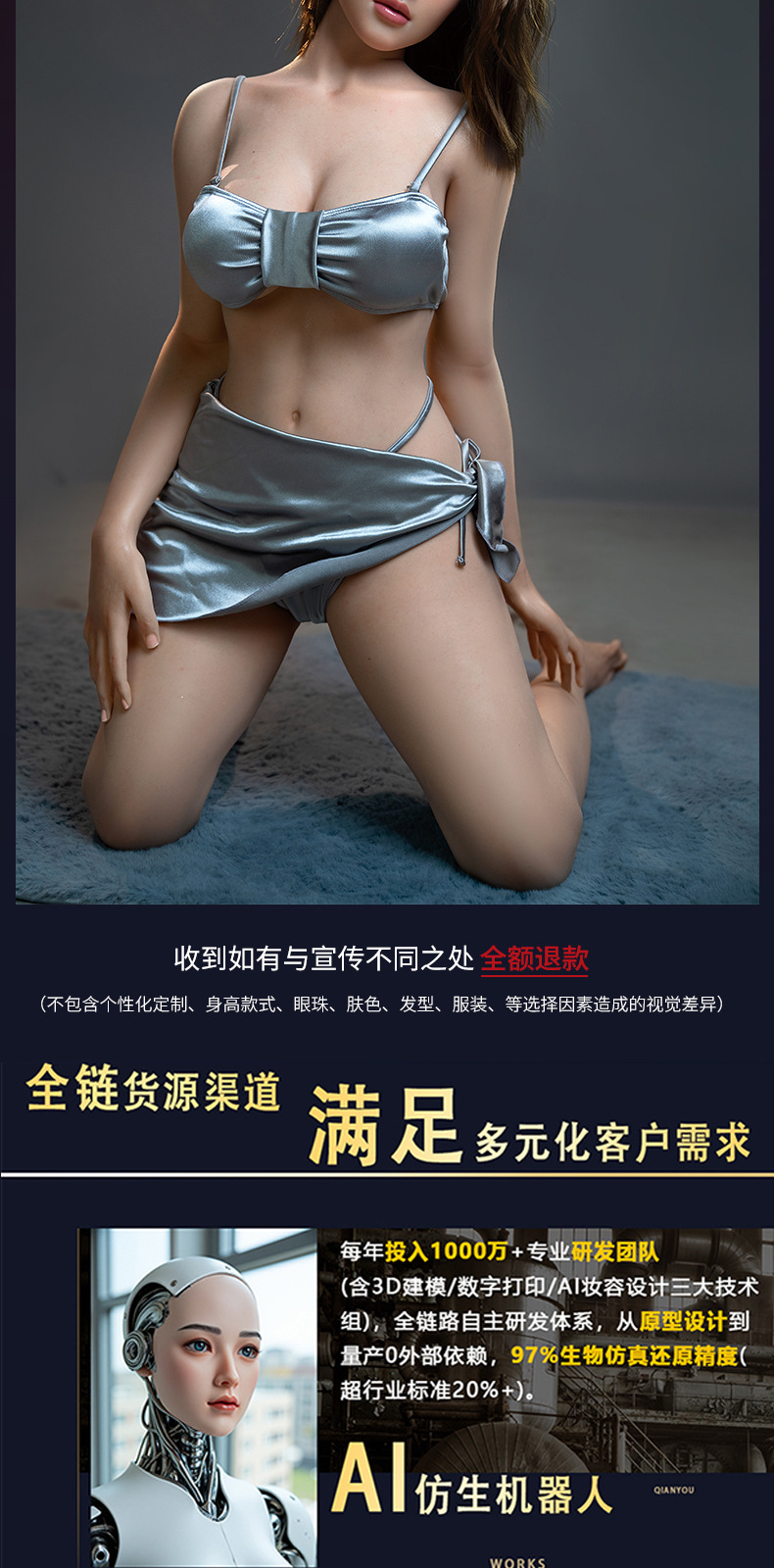 我们的娃娃全部都是全实体带骨架的实体娃娃,网络上面10元到400元的娃娃或者800元左右1.6米身高或者1.7米身高的娃娃,全部都是充气娃娃或者半充气娃娃。商家会拿一些假图片、假视频欺骗您说是实体娃娃!