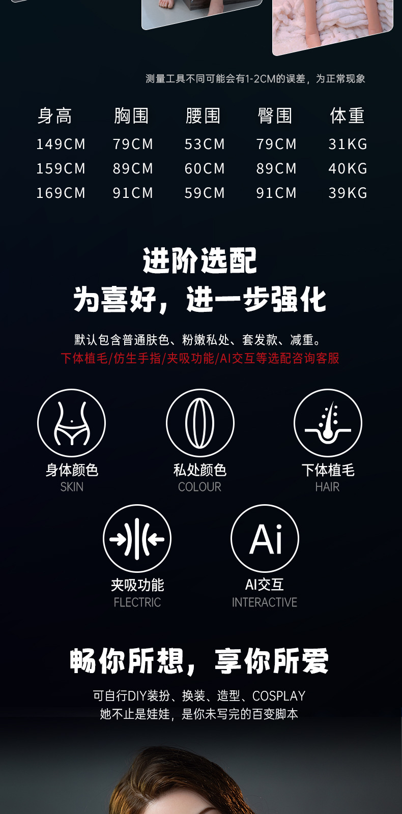 都说娃圈美女千千万,是的,没错!我们的实体娃娃头型和身体是可以自由搭配的,我们工厂目前大概有2000多个头型款式供您挑选,身高有40厘米到1.7米可选,每个实体娃娃内置合金瑜珈骨架,姿势和动作任您摆弄,是您的私人专属高级玩偶。