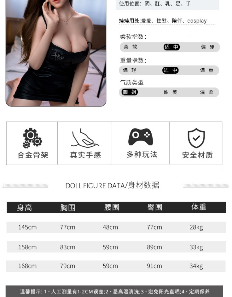 我们的娃娃全部都是全实体带骨架的实体娃娃,网络上面10元到400元的娃娃或者800元左右1.6米身高或者1.7米身高的娃娃,全部都是充气娃娃或者半充气娃娃。商家会拿一些假图片、假视频欺骗您说是实体娃娃!