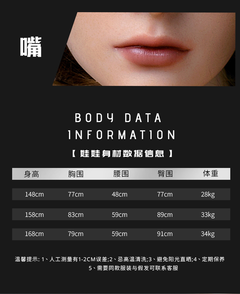 我们的娃娃全部都是全实体带骨架的实体娃娃,网络上面10元到400元的娃娃或者800元左右1.6米身高或者1.7米身高的娃娃,全部都是充气娃娃或者半充气娃娃。商家会拿一些假图片、假视频欺骗您说是实体娃娃!