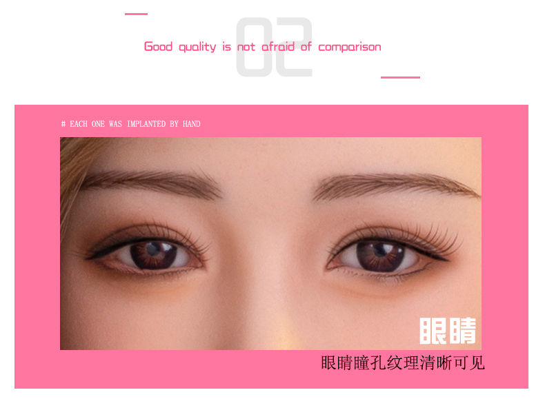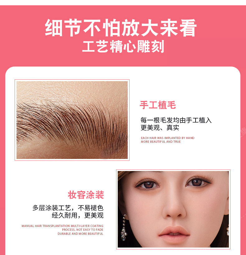 我们工厂成立于2013年,我们拥有10多年的实体娃娃生产经验,是行业当中的佼佼者,我们拥有21年经验的艺术雕刻大师,用独特的手工雕刻将实体娃娃的脸型精细运用到极致,让您看着就很有感觉,整个立体五官轮廓也是非常精致漂亮可爱,那种感觉叫做刚刚好,特别是穿好丝袜,穿上性感情趣衣服的时候,视觉上跟真人没什么区别,那前凸后翘的火辣身段,修长白晳的大美腿,完美白晳无暇的肌肤,清澈明亮的瞳孔,弯弯的柳叶眉,性感的双唇如玫瑰花瓣娇嫩欲滴,长长的睫毛微微地颤动着,身体的毛孔和血管青筋若隐若现,酥胸软似云,当您触摸她的时候,您会发现,她的手感其实比真人还要香!这不就是一个真人吗?