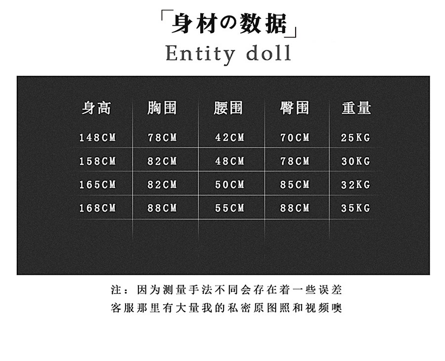 我们的娃娃全部都是全实体带骨架的实体娃娃,网络上面10元到400元的娃娃或者800元左右1.6米身高或者1.7米身高的娃娃,全部都是充气娃娃或者半充气娃娃。商家会拿一些假图片、假视频欺骗您说是实体娃娃!