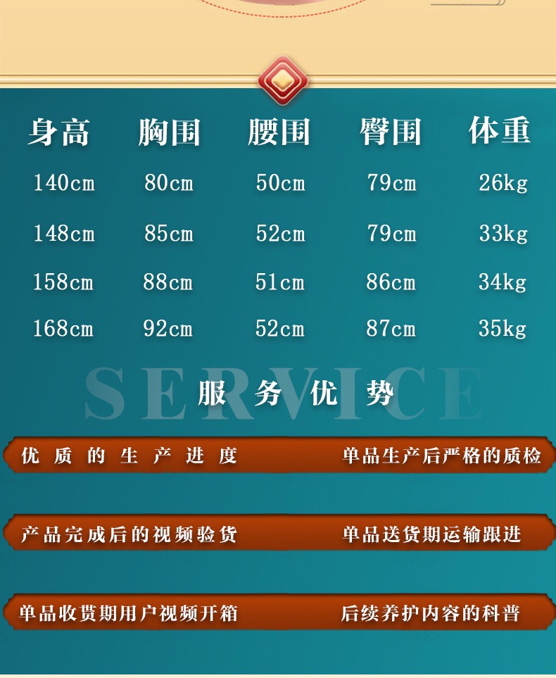 我亲爱的客户,您好!本工厂在此对您承诺,同一质量,同一身高,同一款娃娃,我们这里最便宜,如果您发现别人比我们便宜,那么您随时拿价格来对比,我们核实之后,赔偿您差价,然后再便宜您100元!就算亏本也要再便宜您100元!说到做到!我们也保证娃娃的质量绝对过关,假一罚十!假一罚十!