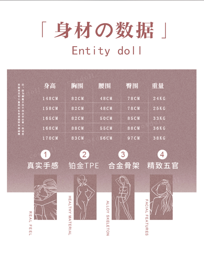 我们的娃娃全部都是全实体带骨架的实体娃娃,网络上面10元到400元的娃娃或者800元左右1.6米身高或者1.7米身高的娃娃,全部都是充气娃娃或者半充气娃娃。商家会拿一些假图片、假视频欺骗您说是实体娃娃!
