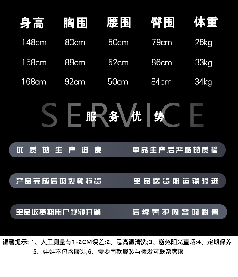 我们的娃娃全部都是全实体带骨架的实体娃娃,网络上面10元到400元的娃娃或者800元左右1.6米身高或者1.7米身高的娃娃,全部都是充气娃娃或者半充气娃娃。商家会拿一些假图片、假视频欺骗您说是实体娃娃!