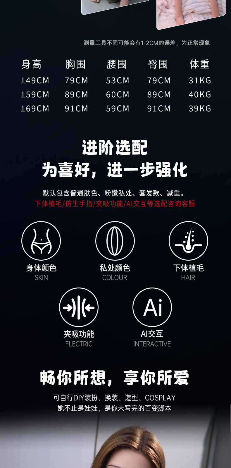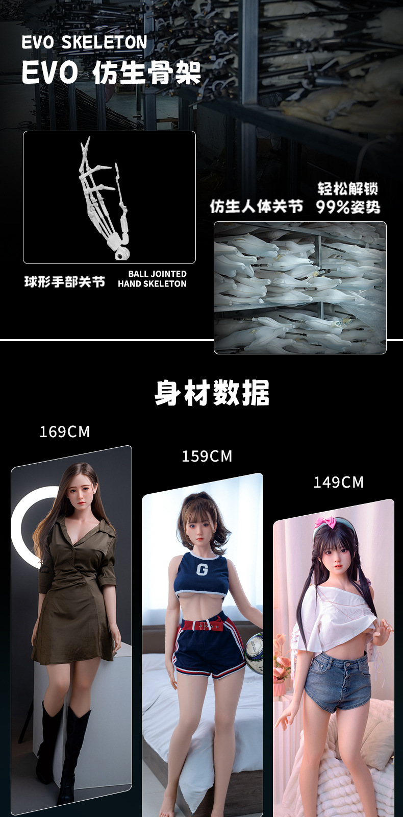 我们工厂成立于2013年,我们拥有10多年的实体娃娃生产经验,是行业当中的佼佼者,我们拥有21年经验的艺术雕刻大师,用独特的手工雕刻将实体娃娃的脸型精细运用到极致,让您看着就很有感觉,整个立体五官轮廓也是非常精致漂亮可爱,那种感觉叫做刚刚好,特别是穿好丝袜,穿上性感情趣衣服的时候,视觉上跟真人没什么区别,那前凸后翘的火辣身段,修长白晳的大美腿,完美白晳无暇的肌肤,清澈明亮的瞳孔,弯弯的柳叶眉,性感的双唇如玫瑰花瓣娇嫩欲滴,长长的睫毛微微地颤动着,身体的毛孔和血管青筋若隐若现,酥胸软似云,当您触摸她的时候,您会发现,她的手感其实比真人还要香!这不就是一个真人吗?