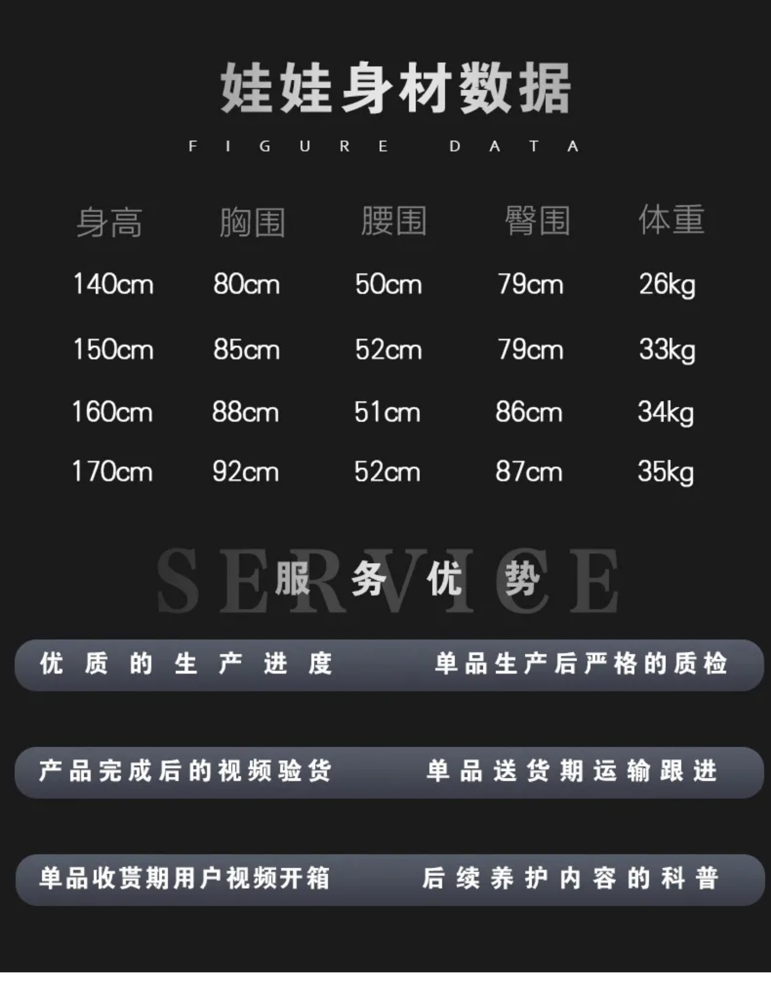 我们的娃娃全部都是全实体带骨架的实体娃娃,网络上面10元到400元的娃娃或者800元左右1.6米身高或者1.7米身高的娃娃,全部都是充气娃娃或者半充气娃娃。商家会拿一些假图片、假视频欺骗您说是实体娃娃!