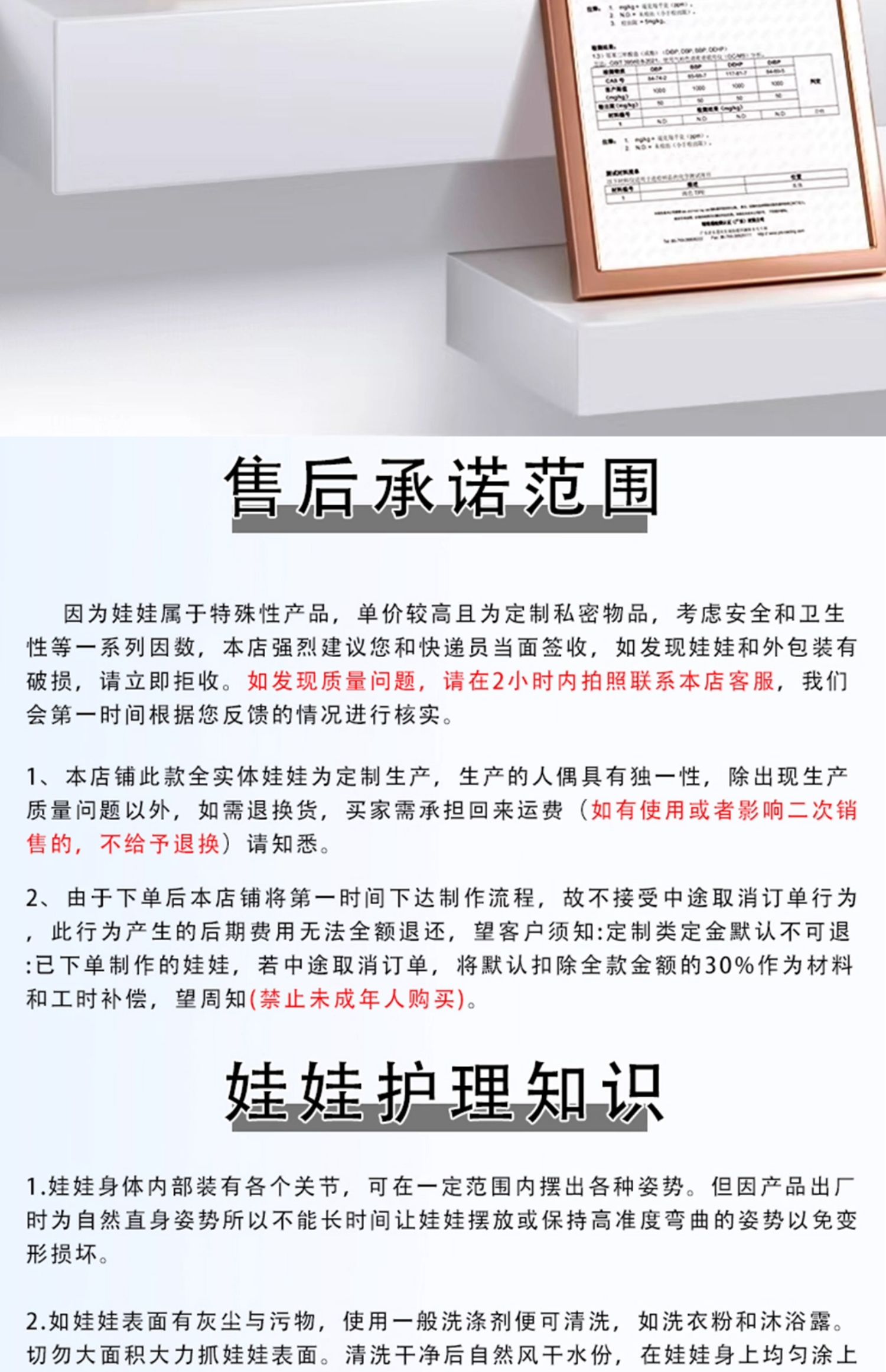 我们的娃娃全部都是硬骨骨架的娃娃,网络上面400元左右1米身高的实体娃娃,骨架都是软的,制作的材料都是回收的二手材料。娃娃是个人私密用品,用这种有毒材质的娃娃,您真的敢用吗?我们工厂生产的娃娃,使用的都是进口医用级别材料,都有安全质检报告的,可以放心安全使用,您可以向我们索取质检报告!