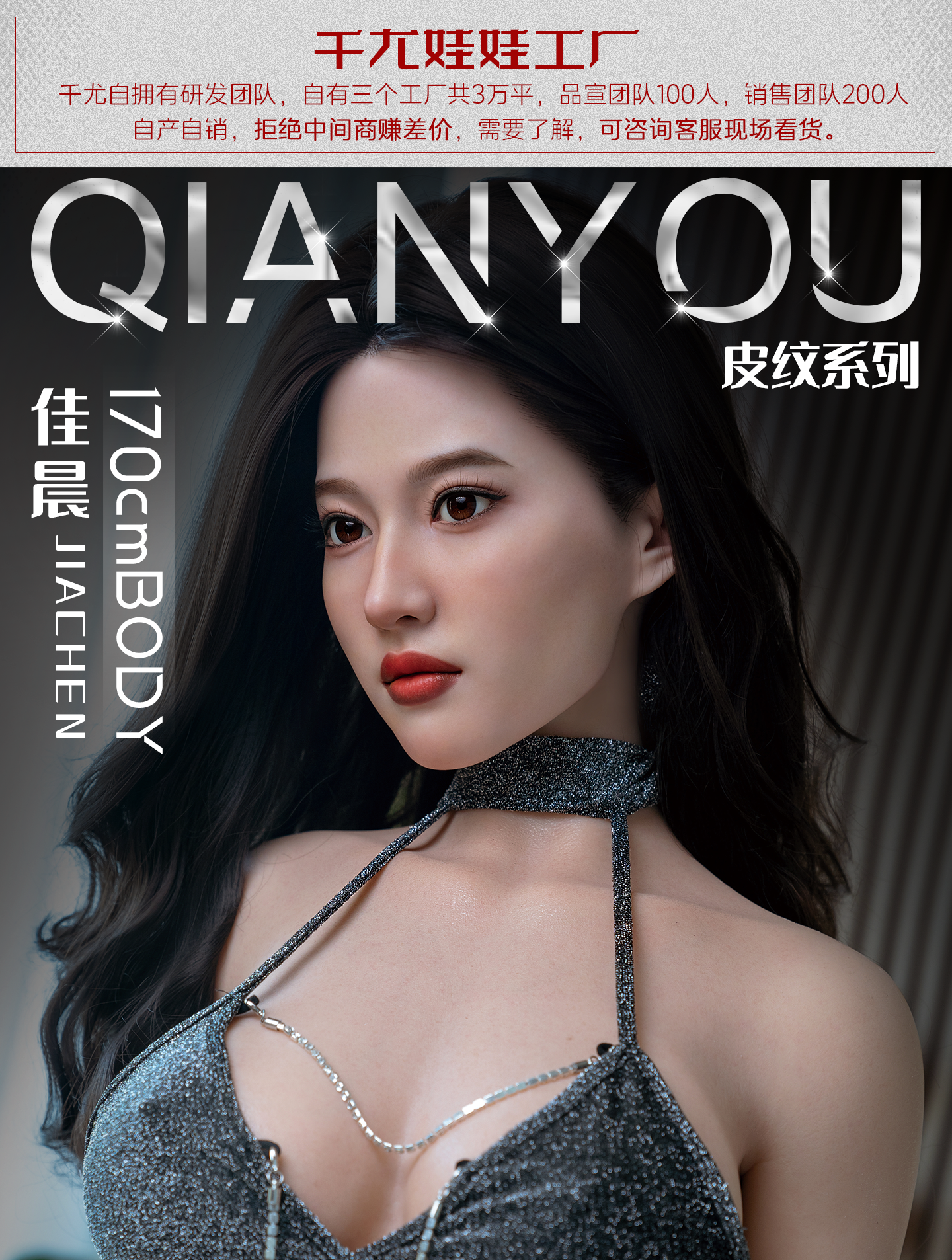 我们工厂成立于2013年,我们拥有10多年的实体娃娃生产经验,是行业当中的佼佼者,我们拥有21年经验的艺术雕刻大师,用独特的手工雕刻将实体娃娃的脸型精细运用到极致,让您看着就很有感觉,整个立体五官轮廓也是非常精致漂亮可爱,那种感觉叫做刚刚好,特别是穿好丝袜,穿上性感情趣衣服的时候,视觉上跟真人没什么区别,那前凸后翘的火辣身段,修长白晳的大美腿,完美白晳无暇的肌肤,清澈明亮的瞳孔,弯弯的柳叶眉,性感的双唇如玫瑰花瓣娇嫩欲滴,长长的睫毛微微地颤动着,身体的毛孔和血管青筋若隐若现,酥胸软似云,当您触摸她的时候,您会发现,她的手感其实比真人还要香!这不就是一个真人吗?