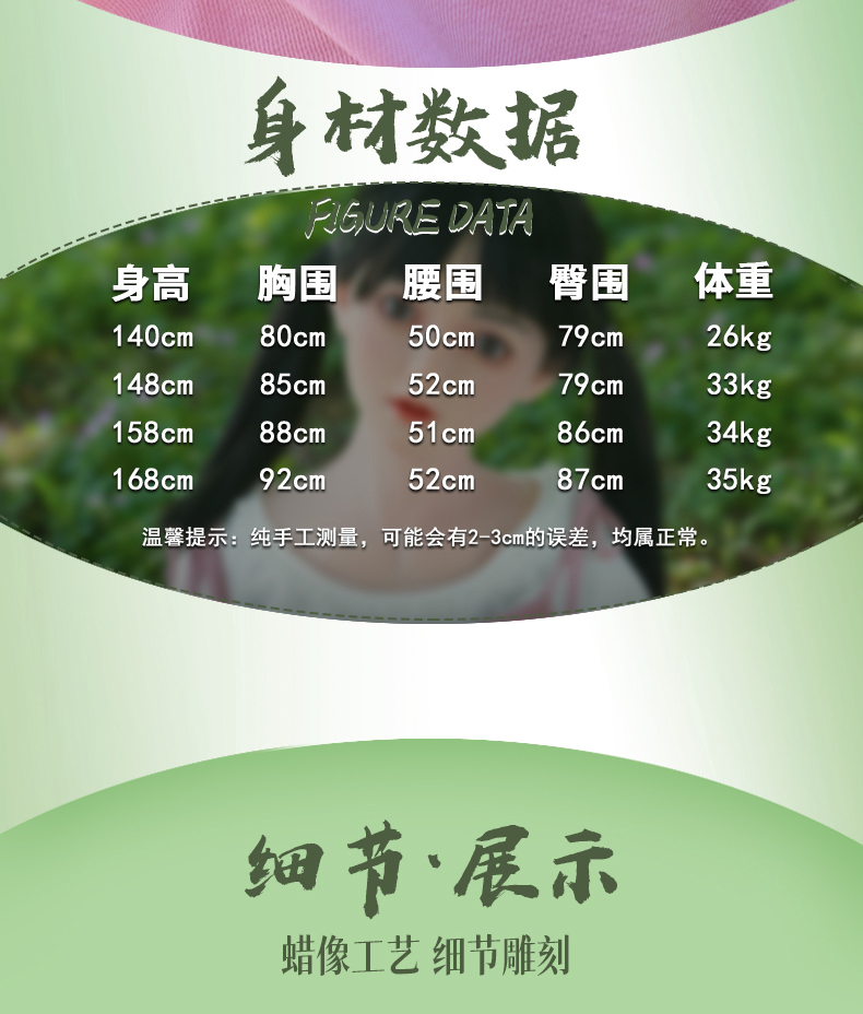 我们的娃娃全部都是全实体带骨架的实体娃娃,网络上面10元到400元的娃娃或者800元左右1.6米身高或者1.7米身高的娃娃,全部都是充气娃娃或者半充气娃娃。商家会拿一些假图片、假视频欺骗您说是实体娃娃!