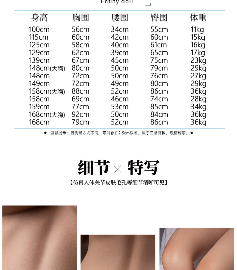 我们的娃娃全部都是全实体带骨架的实体娃娃,网络上面10元到400元的娃娃或者800元左右1.6米身高或者1.7米身高的娃娃,全部都是充气娃娃或者半充气娃娃。商家会拿一些假图片、假视频欺骗您说是实体娃娃!