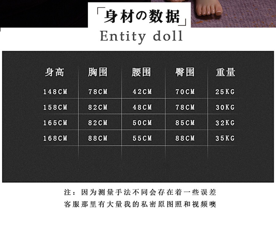 我们的娃娃全部都是全实体带骨架的实体娃娃,网络上面10元到400元的娃娃或者800元左右1.6米身高或者1.7米身高的娃娃,全部都是充气娃娃或者半充气娃娃。商家会拿一些假图片、假视频欺骗您说是实体娃娃!