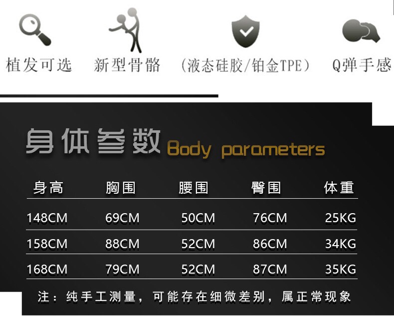 我们的娃娃全部都是全实体带骨架的实体娃娃,网络上面10元到400元的娃娃或者800元左右1.6米身高或者1.7米身高的娃娃,全部都是充气娃娃或者半充气娃娃。商家会拿一些假图片、假视频欺骗您说是实体娃娃!