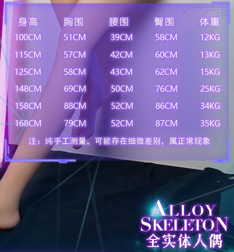 我们的娃娃全部都是全实体带骨架的实体娃娃,网络上面10元到400元的娃娃或者800元左右1.6米身高或者1.7米身高的娃娃,全部都是充气娃娃或者半充气娃娃。商家会拿一些假图片、假视频欺骗您说是实体娃娃!